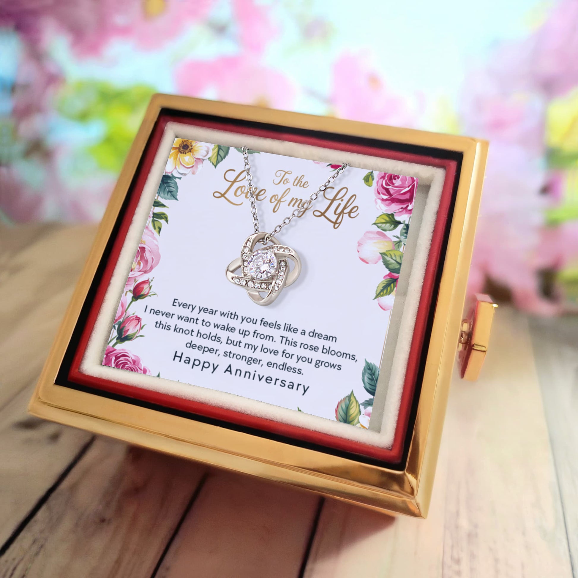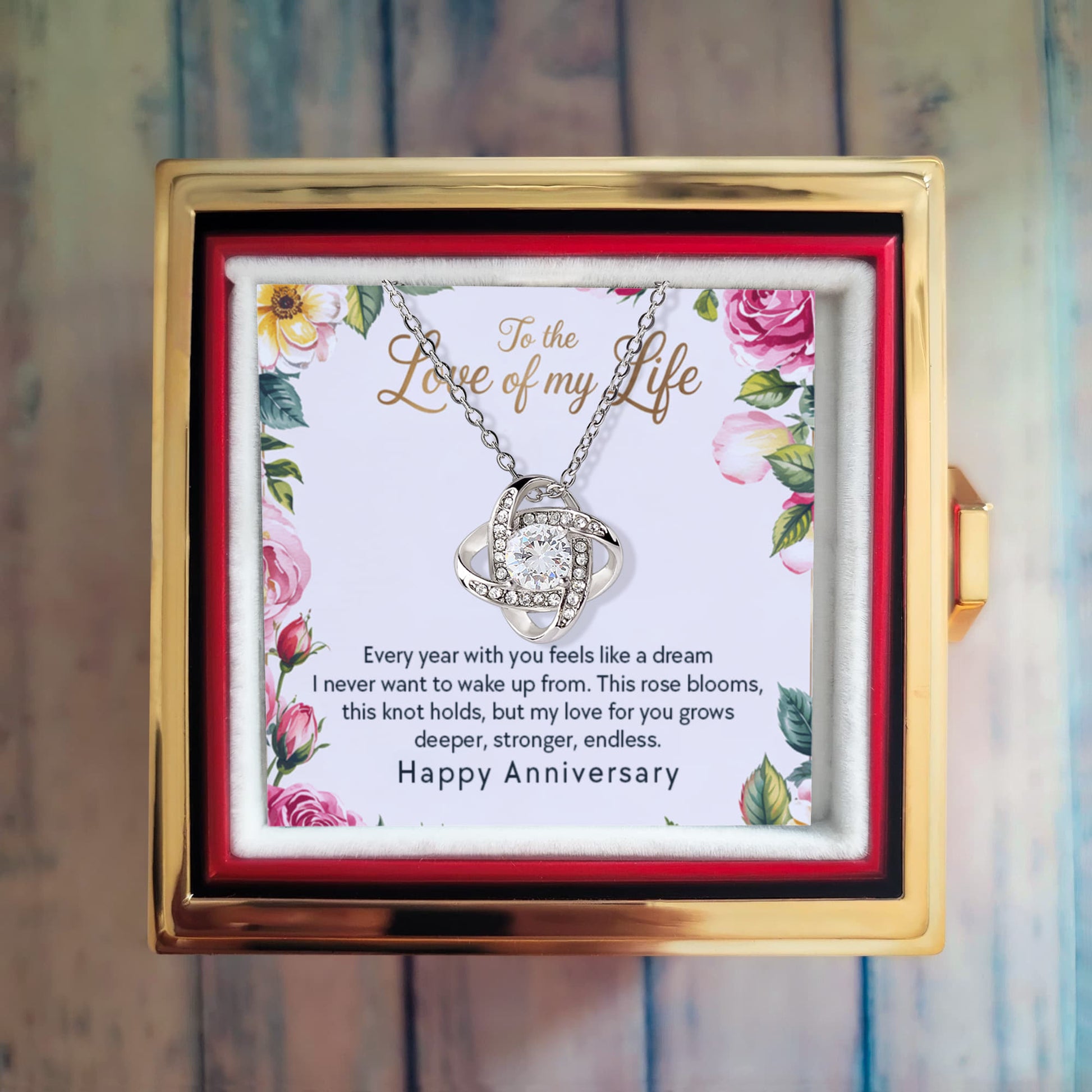 Imagine her reaction as she receives this beautiful Love Knot Necklace. Representing an unbreakable bond between two souls, this stunning pendant is adorned with premium cubic zirconia crystals, making it a timeless symbol of love and devotion. The luxurious box, featuring a meticulously preserved rose that never fades, adds an extra touch of love. With a simple turn of the gold knob, her breathtaking gift is revealed—making it the perfect sentimental gift for that special someone.